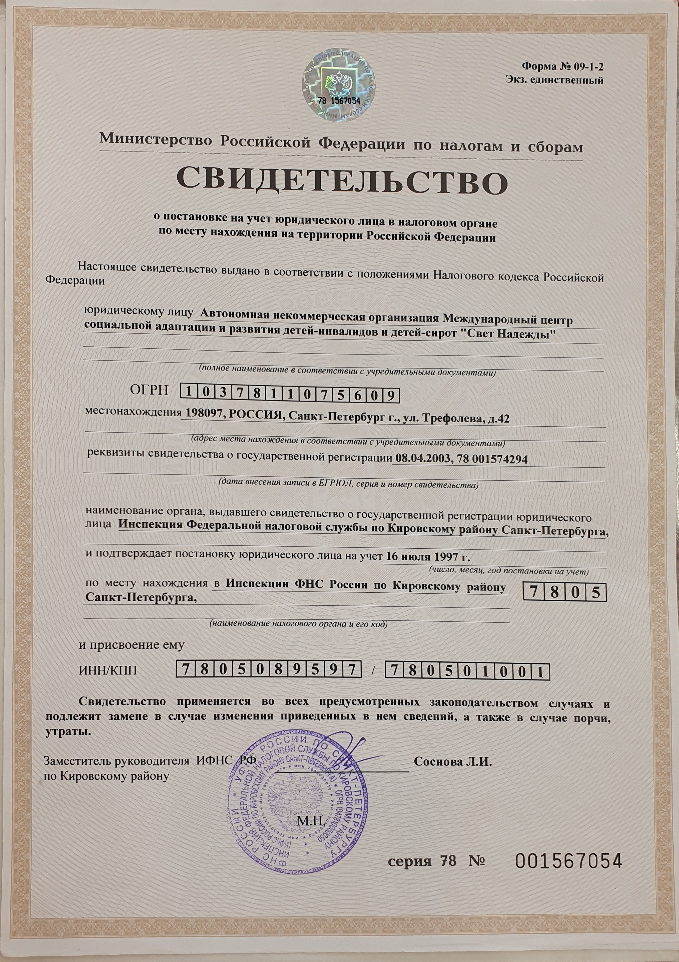 Официальные регистрационные и банковские данные АНО МДЦ «Свет Надежды».